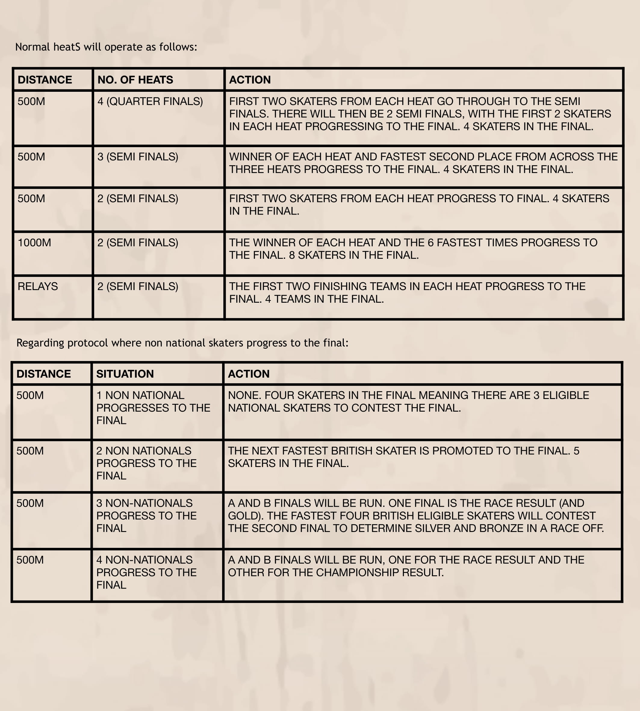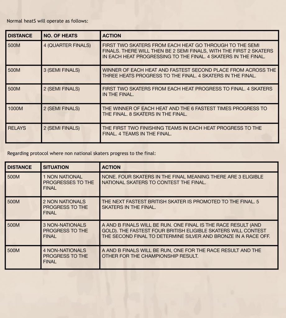 If a non-national skater progresses to the final in the 500m, this may result in a British skater being promoted to the final if required to determine a British Championship result. If more than one non-national progresses to the final, then A and B finals will be run to determine the Championship result.